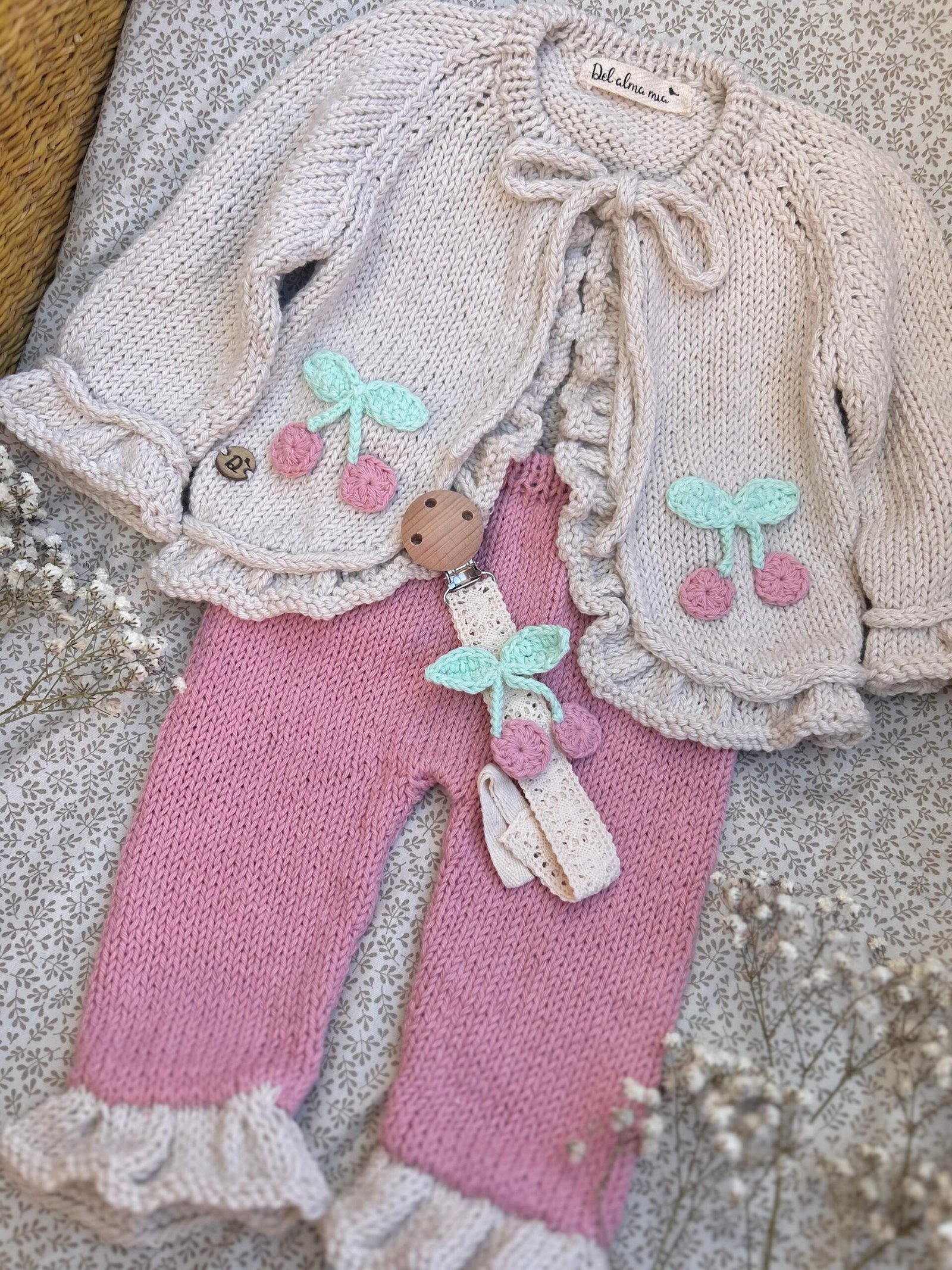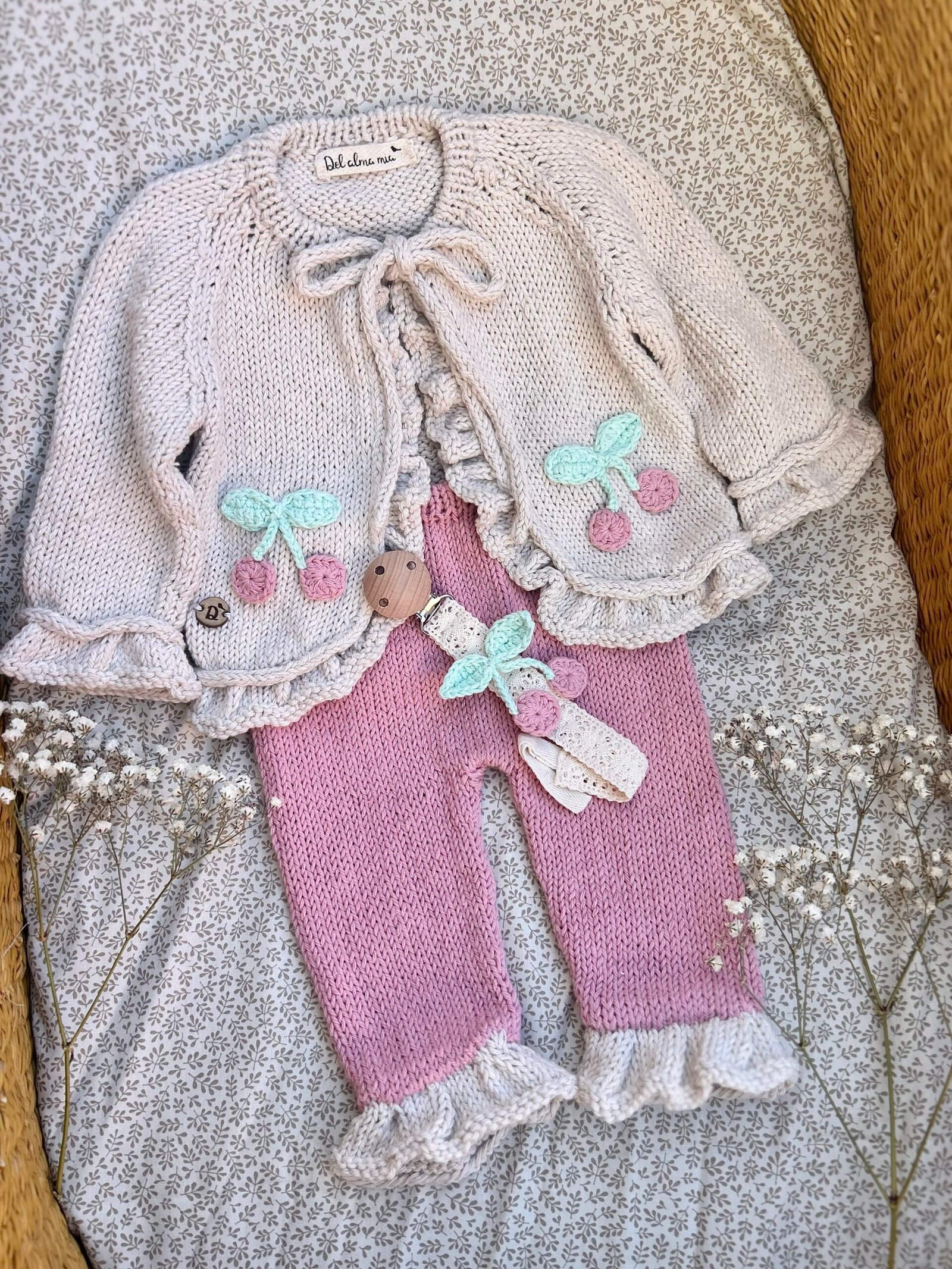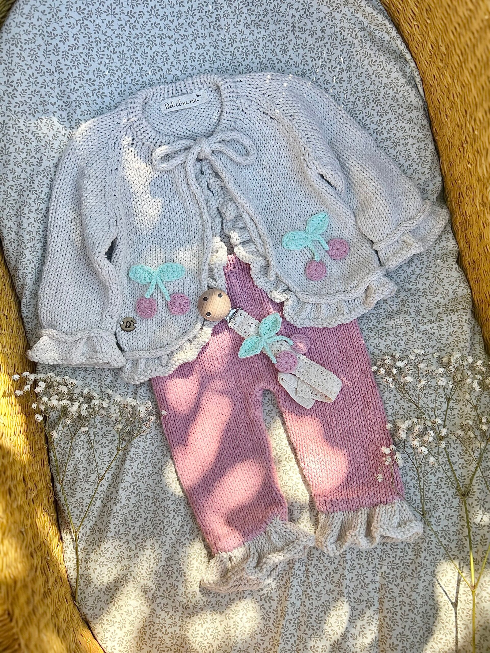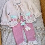 Conjunto soñado tejido a mano en hilo de algodón 100%, ideal para bebas que nacen entre septiembre y marzo.