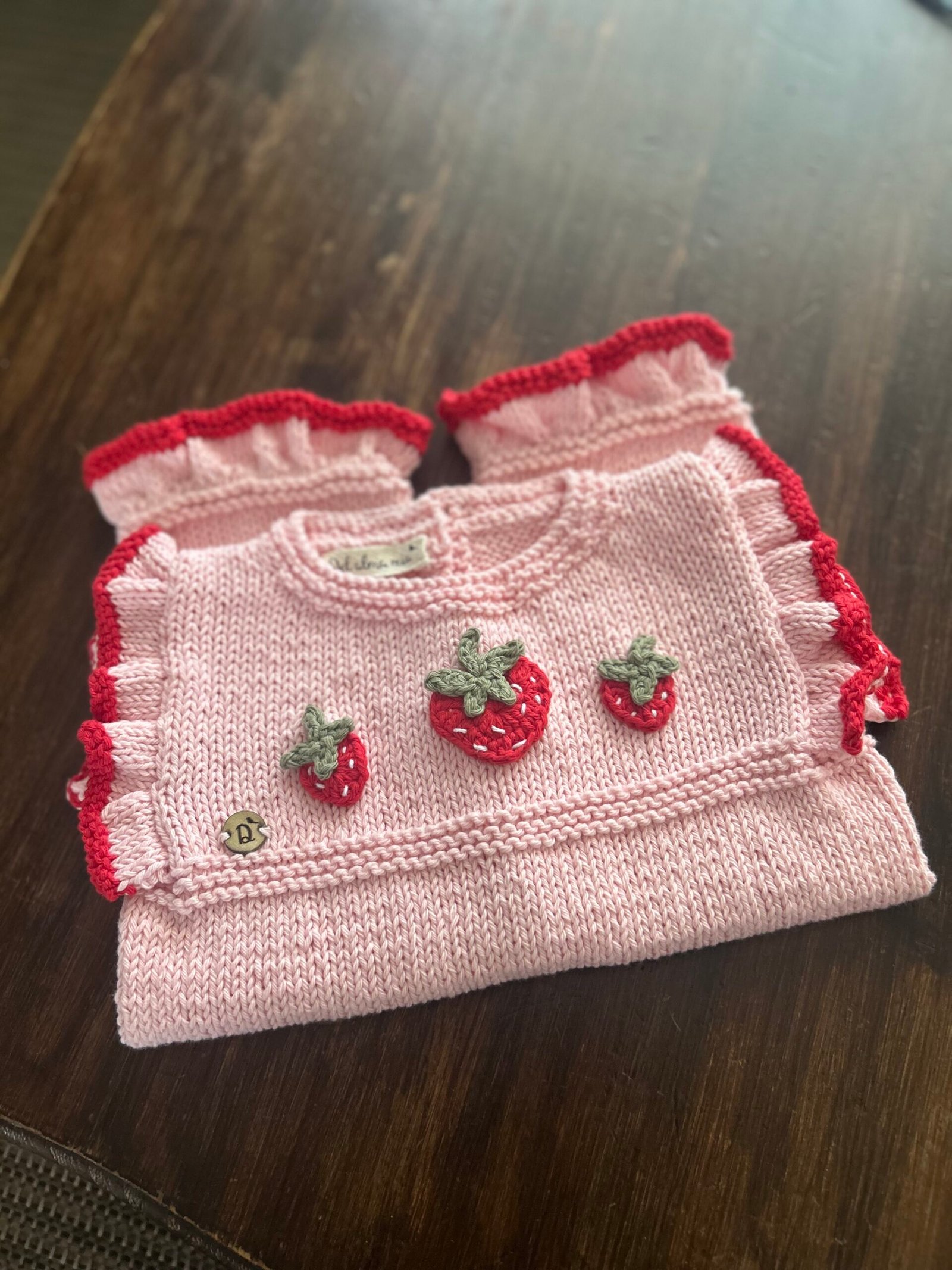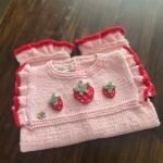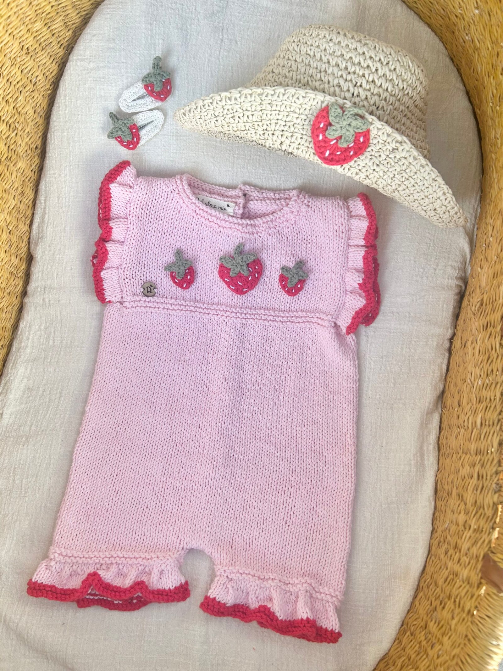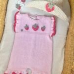 Enterito Bombachudo tejido a mano en hilo de algodón 100% con apliques de frutillas en crochet.